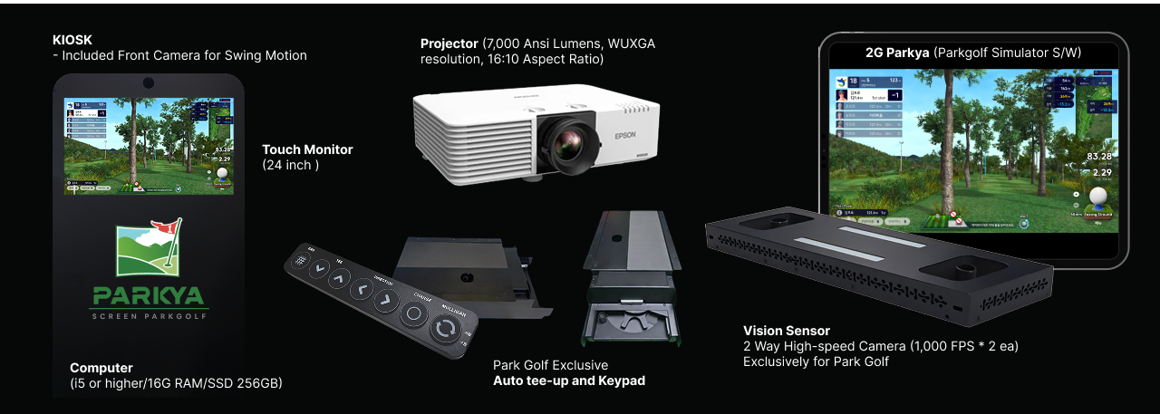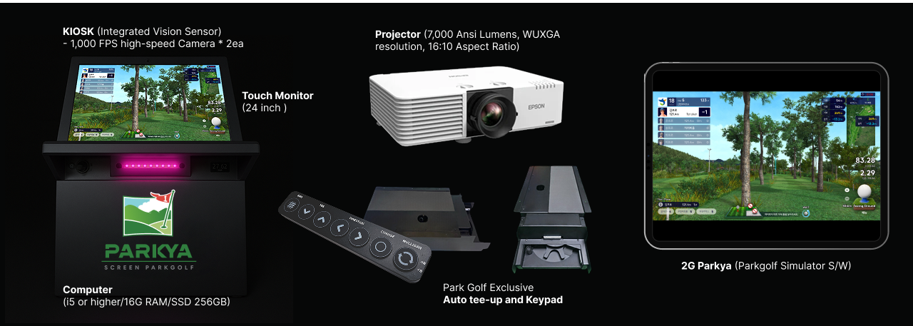 파크야는 공원에서 즐기던 파크골프의 현장을 그대로 실내에서 가상의 골프 코스를 경험할 수 있는 시스템을 담아 공간을 구현해두었습니다.